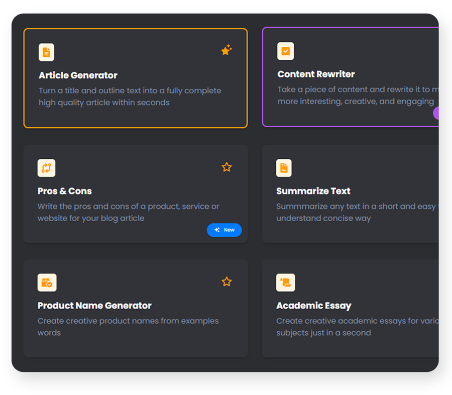 Escolha entre uma ampla variedade de ferramentas de IA para escrever anúncios em redes sociais, seçes de destaque, posts de blog, ensaios, etc...